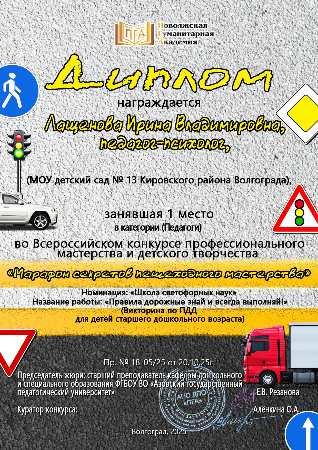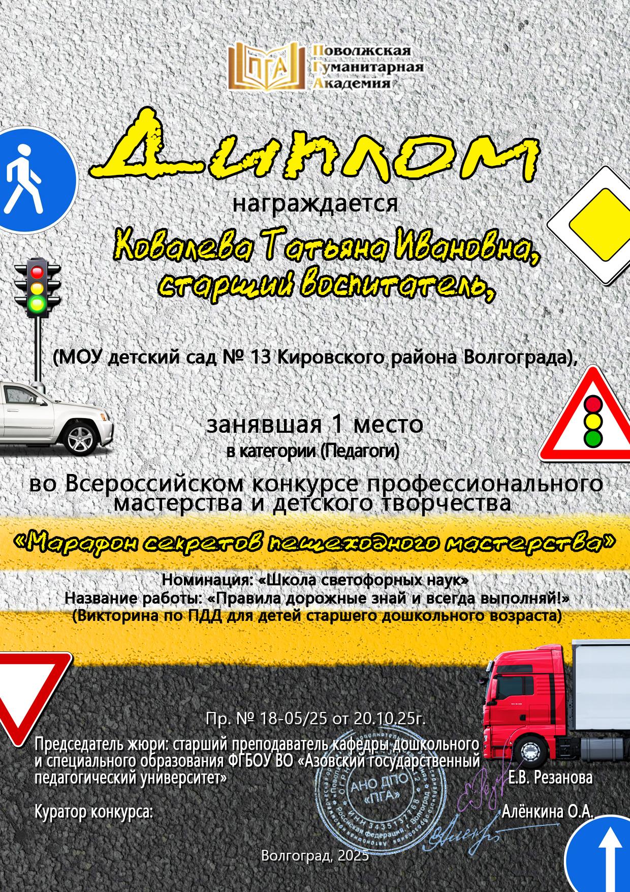 Педагоги детского сада приняли участие во Всероссийском конкурсе профессионального мастерства и детского творчества "Марафон секретов пешеходного мастерства" в номинации "Школа светофорных наук" и заняли I место, предоставив на конкурс работу "Правила дорожные знай и всегда выполняй!" (Викторина по ПДД для детей старшего дошкольного возраста).