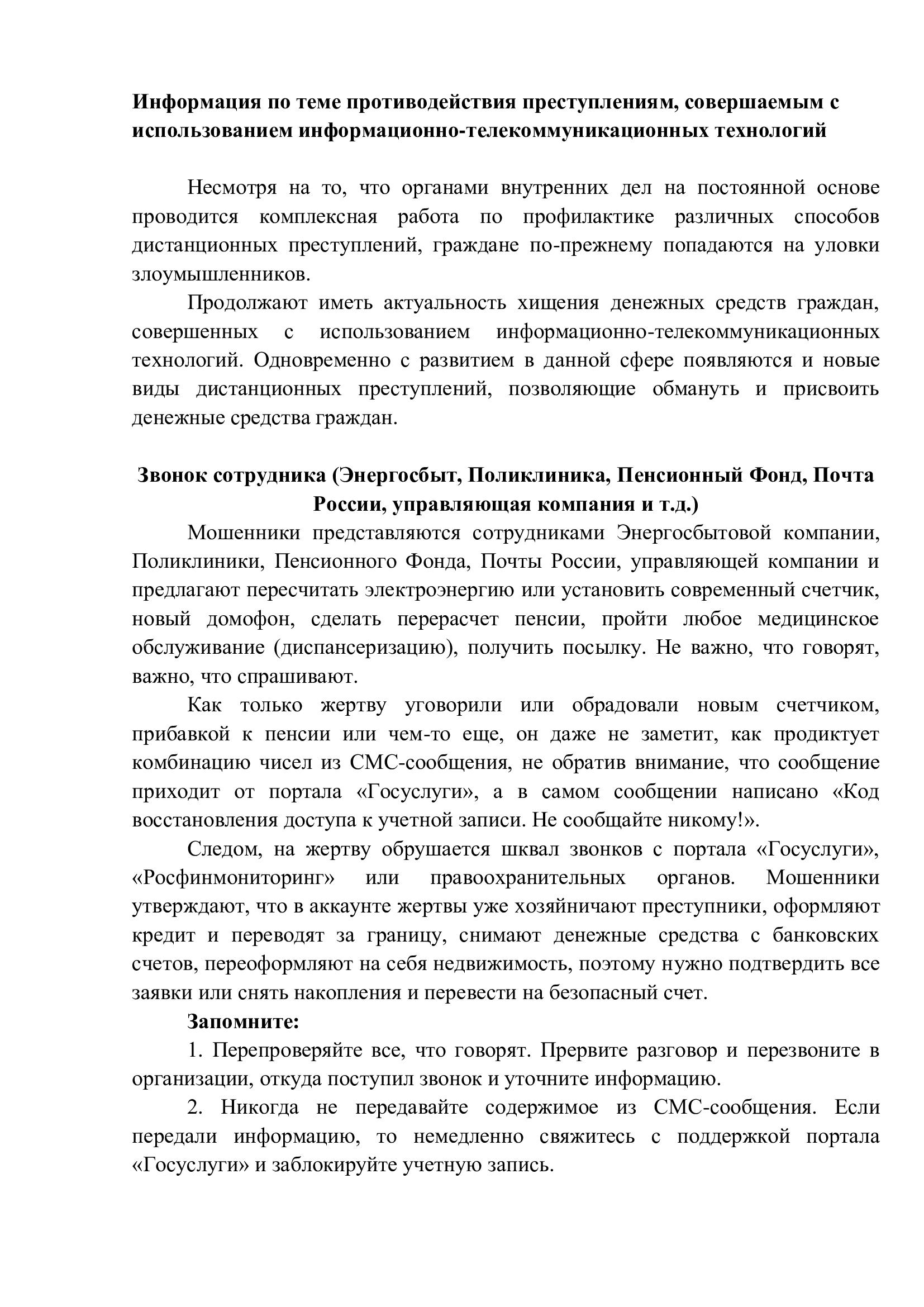 ПАМЯТКА для граждан о профилактике и предупреждении дистанционных преступлений в сфере информационно-телекоммуникационных технологий: